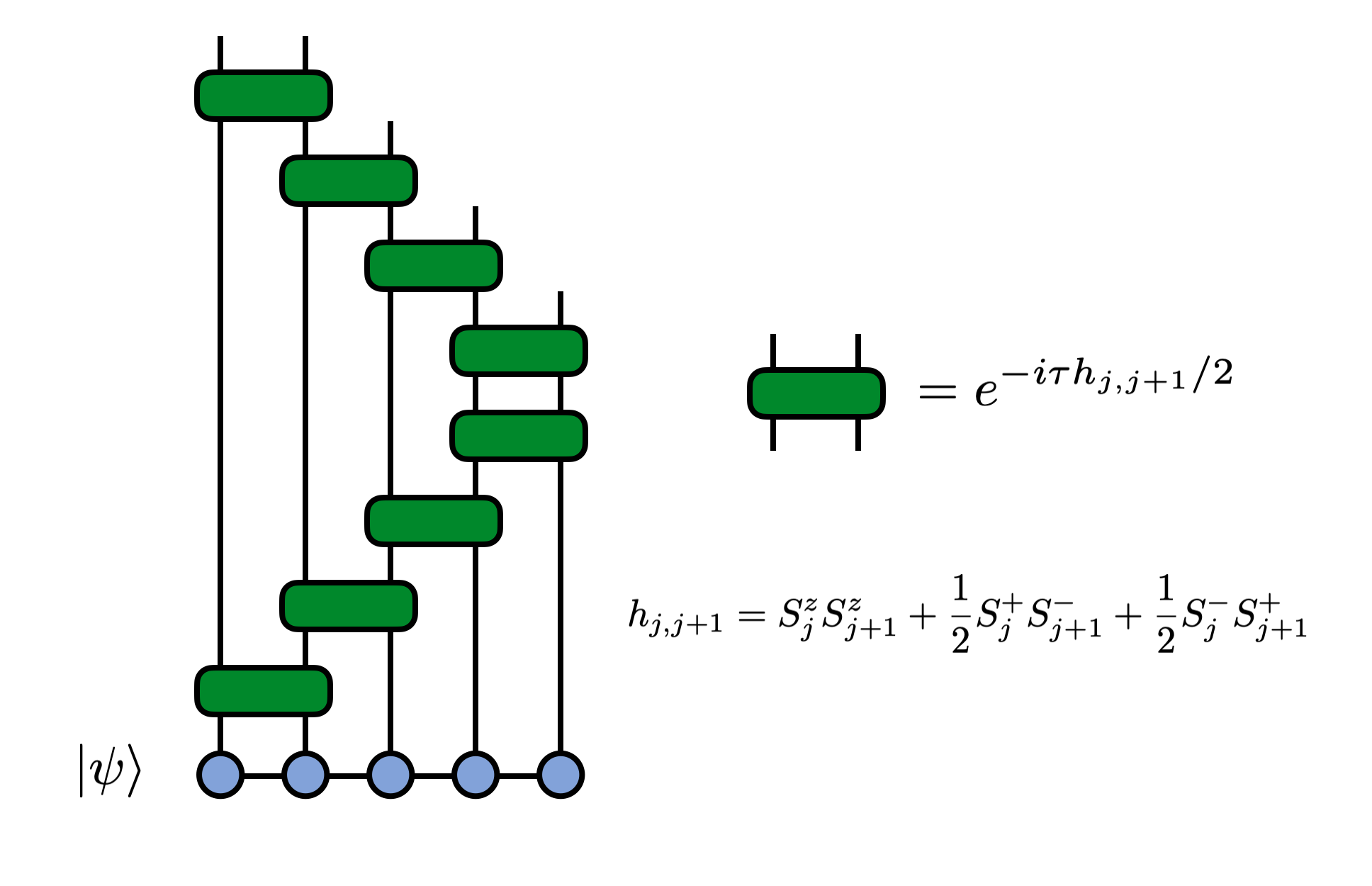 The technique we will use is "time evolving block decimation" (TEBD). More simply it is just the idea of decomposing the time-evolution operator into a circuit of quantum 'gates' (two-site unitaries) using the Trotter-Suzuki approximation and applying these gates in a controlled way to an MPS.