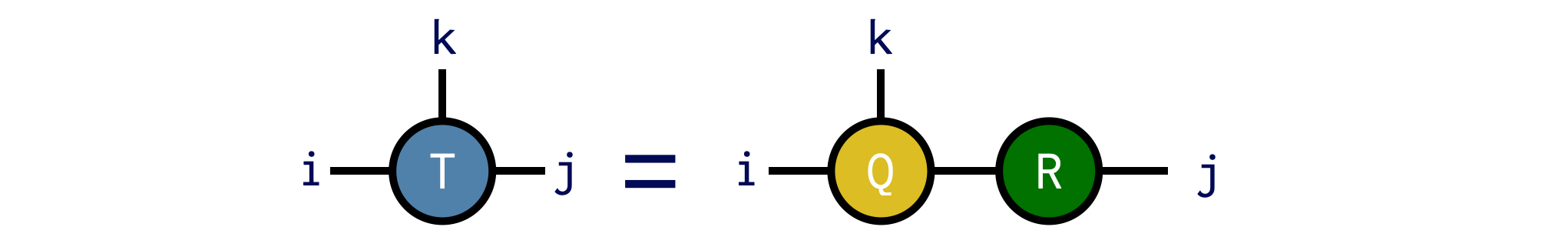 Say we want to compute the QR factorization of an ITensor T with indices i,j,k, putting the indices i and k onto Q and the remaining indices onto R. We can do this as follows: