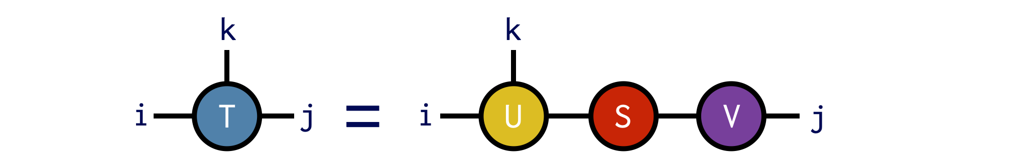 ITensor offers various tensor factorizations, such as the singular value decomposition (SVD) and the QR factorization. These are extended to the case of tensors by treating some of the indices as the "row" indices and the rest of the indices as the "column" indices, reshaping the tensor into a matrix to carry out the factorization, then restoring the tensor structure at the end. All of these steps are done for you by the ITensor system as we will see below.