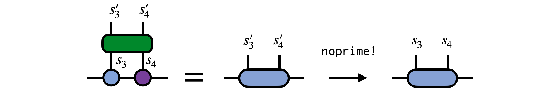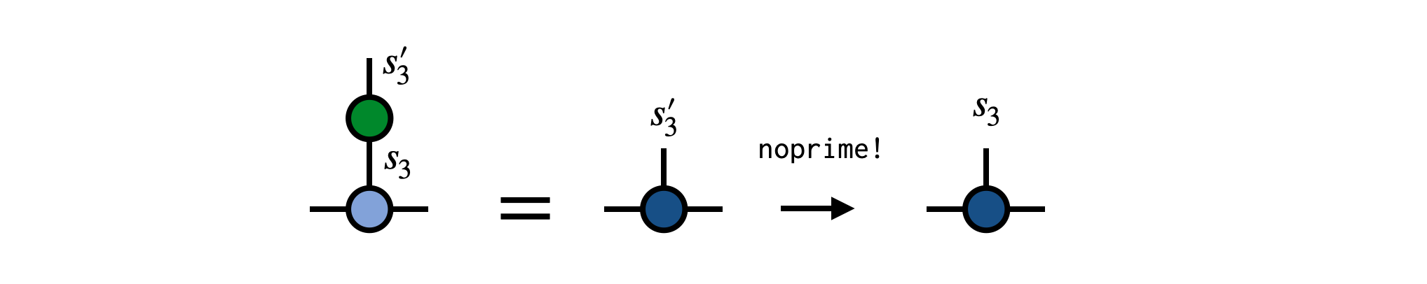 To carry out this operation, contract the operator G with the MPS tensor for site 3, removing the prime from the $s'_3$ index afterward: